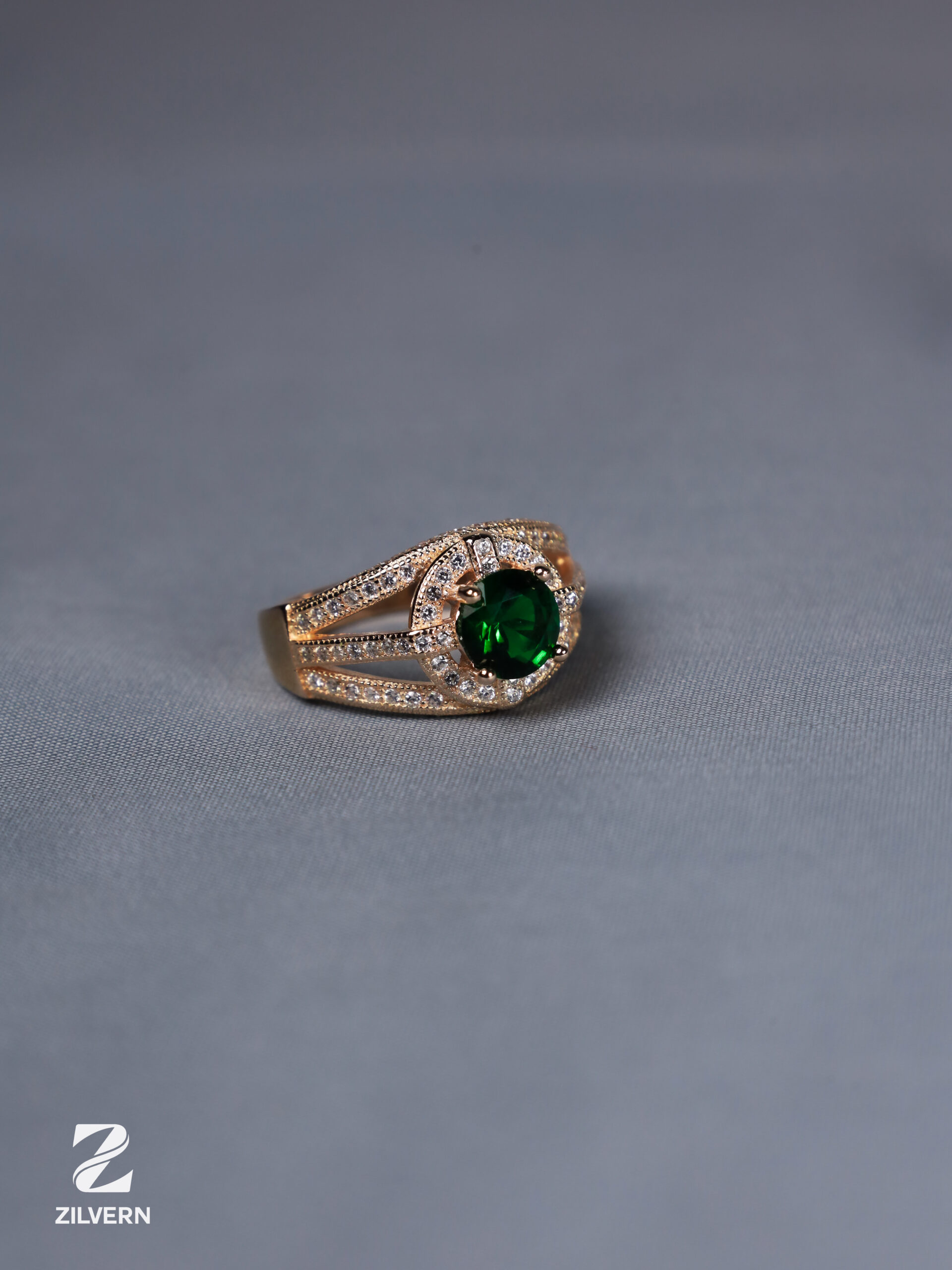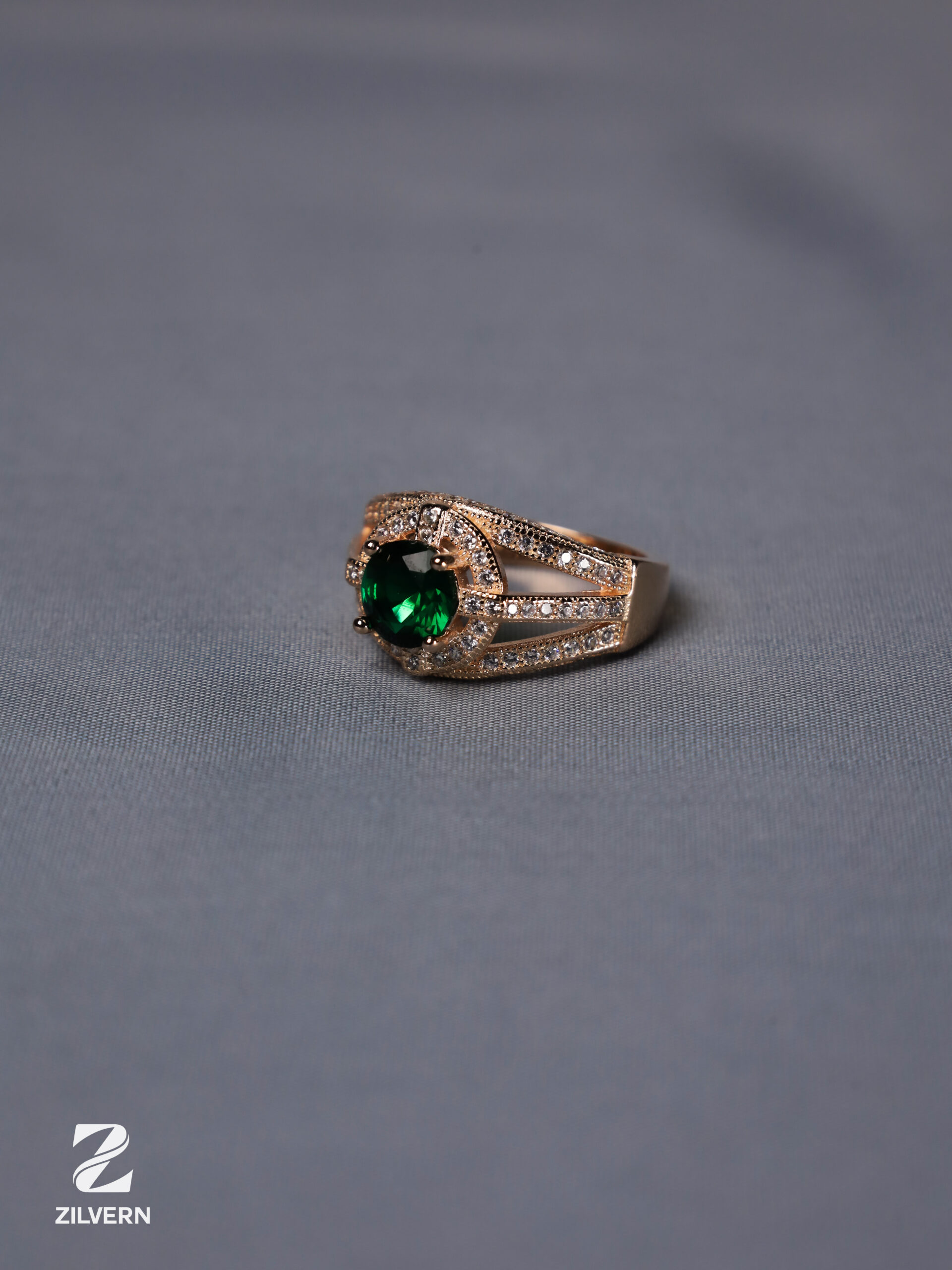 The Emerald Royale Ring features a rich emerald hue paired with a regal design. Ideal for festive occasions, weddings, and statement styling.